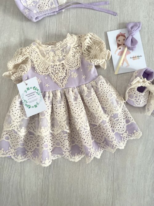 Setul contine rochita, boneta, chilotel si botoseii cu numele bebelusei.