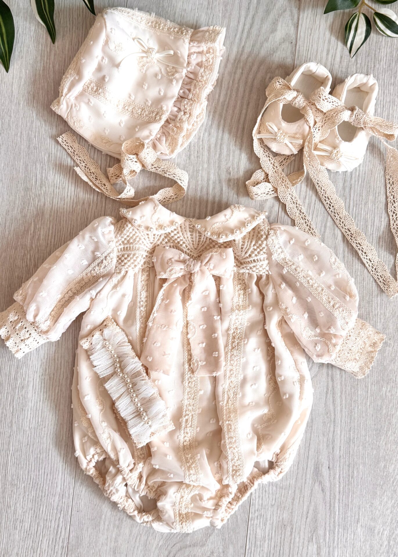 Fiecare cusătură, fiecare alegere de material și culoare este făcută cu gândul la confortul micuților care vor purta aceste creații unice. Am folosit bumbac moale, tulle cu dantela de bumbac si perlute ivory pentru a aduce o nota de eleganta.