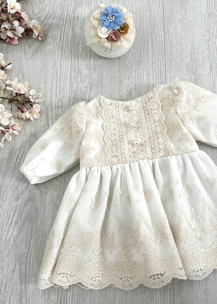Rochita Aria pe cat de simpla este, pe atat de delicata o veti gasi. Lucrata din cel mai moale bumbac si imbracata in dantela fina bej o face tinuta perfecta pentru pielea delicata a bebeluselor.