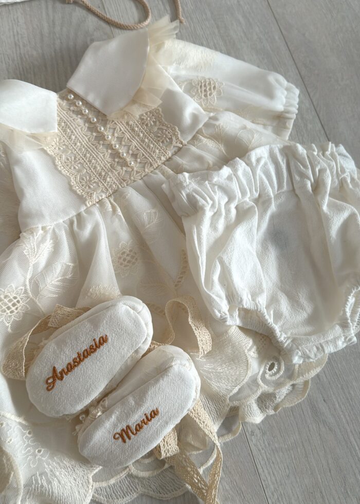 Setul contine rochita, boneta, chilotel si botoseii cu numele bebelusei.