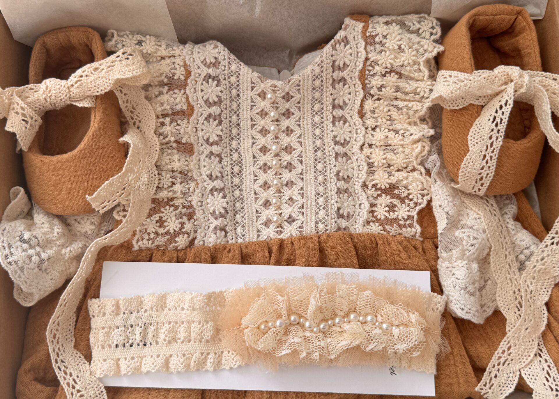 Setul este completat armonios de bentița delicată asortată, creând o ținută boemă, ideală pentru botez, ședințe foto, aniversări sau evenimente speciale. Este o alegere inspirată și ca idee de cadou premium, fiind potrivit atât pentru momentele speciale, cât și pentru apariții memorabile.